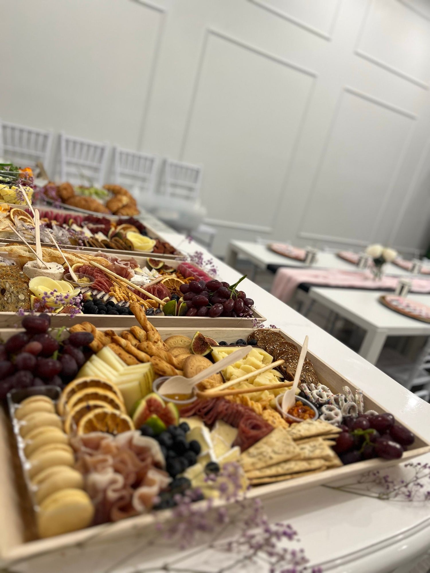 Wooden trays placed edge to edge give the look of one continuous graze with the practicality of trays.
