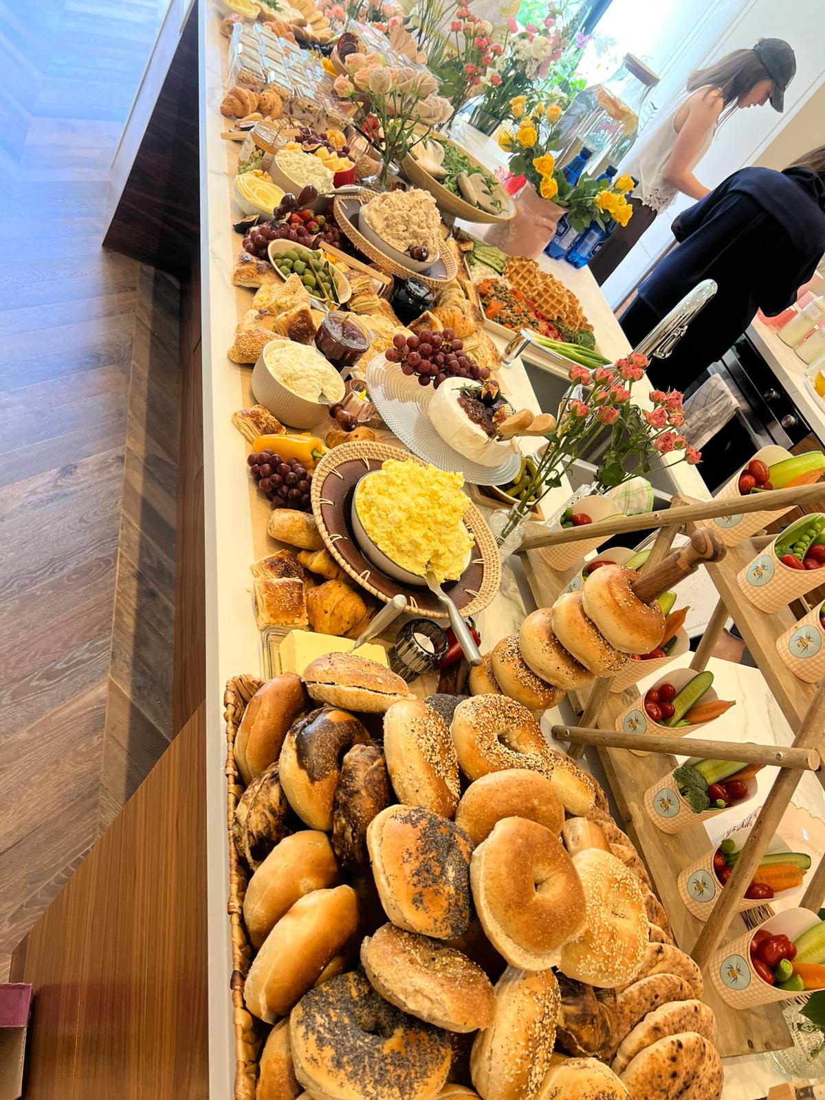 Brunch items such as pastries, smoked salmon, and quiche