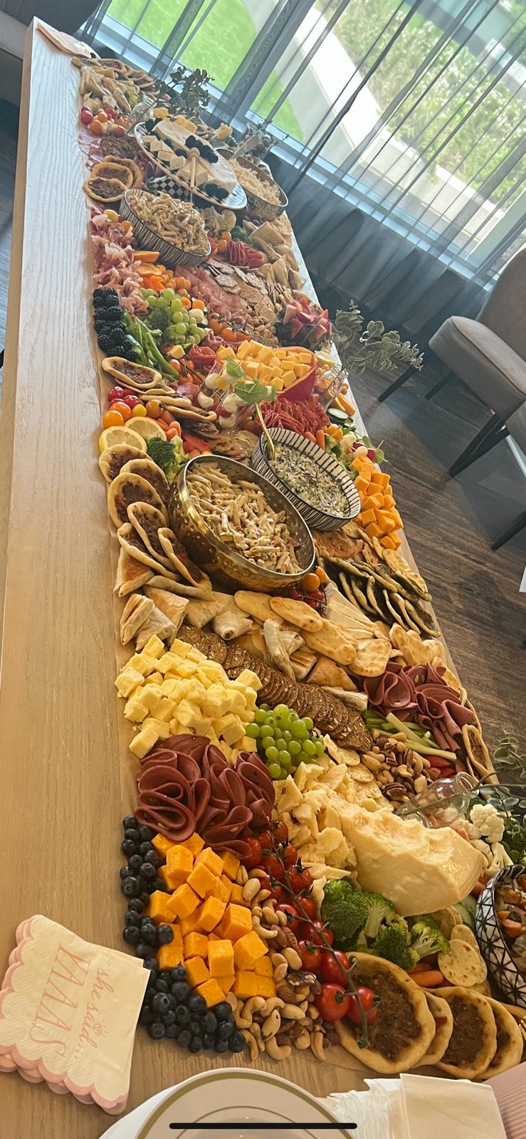 Artisan cheeses, charcuterie, fresh fruit and vegetables, dips, nuts, crackers and breads, garnish, labels, and serve ware where applicable.